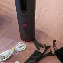 I was not sure what to expect from this cordless automatic curler. It is pretty small and compact and overall pretty inexpensive too. I have to say, now having tested it out, I am pretty impressed with this little powerhouse. Once fully charged you can easily do your entire hair. After you read the instructions it is very easy to use. When you push the menu button that is also the power button you can toggle through the different settings that you can adjust. R/L is right vs left curl. Then you can adjust the temperature as well as the time of how long. The longer the stronger the curl is really. The thicker your hair the hotter temperature you should use really. I like that there is no cord that gets in the way. I also like that the outer barrel of the curler stays pretty cool, cool enough so you can touch it if you want. It definitely gets warm but you won’t get burned by it. The overall weight is pretty light so your arms don’t get tired. I like that you can change the direction of it so you can work easily on both sides of your head and even change the direction of the curls on the same side if you want. I haven’t had any issues getting my hair stuck or tangled in any way. The way I use it, and since it doesn’t show that anywhere it may not be right, I take a small section of my hair and kind of add it near my scalp into the curler. The curler then pulls the rest of it into the curler. When the hair is done you just gently pull the curler away from your head and voila, you have curls. I don’t know if you need to start at the other end but this seems to work for me just fine so this is how I will do it. Their picture kind of shows putting in the tip but I just can’t see that working well pulling in the hair that way. All in all I really like the curls this makes and am really happy on how easy this is to use.