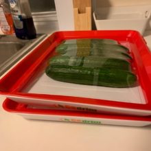 I had been tempted by advertisements for these food preservation trays for a while and finally took the plunge. I think they are great! You can put an entire lunch in them or leftovers and they are much more compact than ziploc containers. The clear cover is stretchy so it can accommodate things with a bit of depth like a sandwich or a banana. They are neat because you can put your lunch in them and they take up about the same amount of space as a laptop in your bag. It slides easily in between your books. In the fridge, they nest together well. Instead of layering leftovers between wax paper, I can divide them up in separate trays and stack them. So far they wash well and return to their original shape after using them. I’m glad I tried them! I will be buying a couple more.
