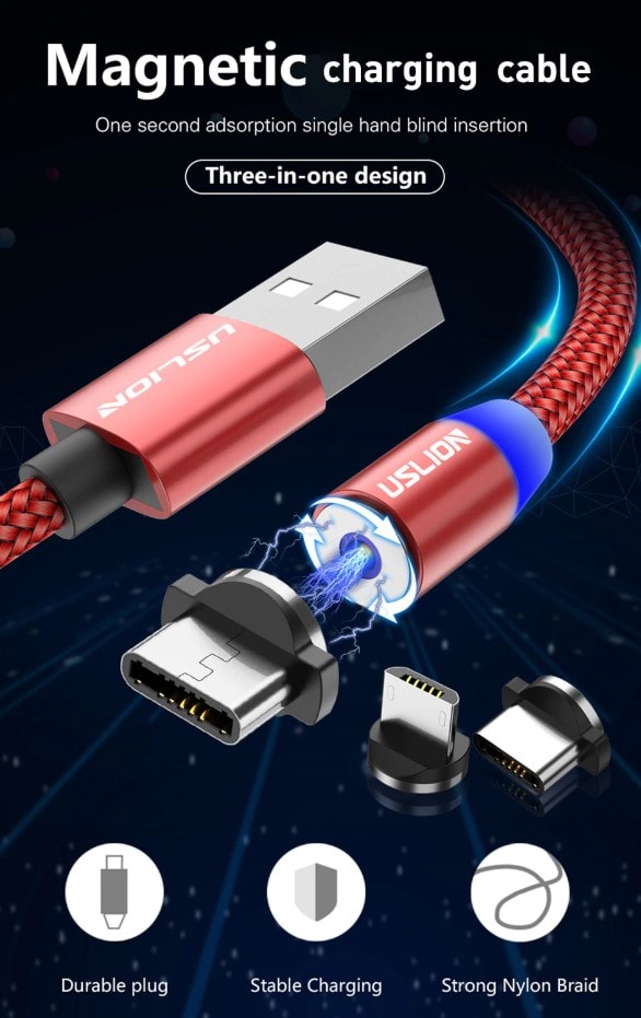 1 magnetic phone charger cable compatible with 3 magnet adapters for i-Product, Android Micro USB & Type C.
