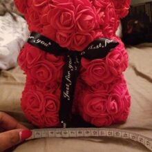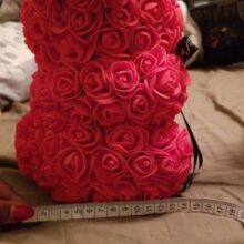 The size fits perfectly my theme. The teddy bear is good quality just one of the rose has a little red tone but we can’t really see it. I’m very happy about the product, it is really cheap for the quality, I recommand! The shipping was a little slow but worth it