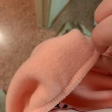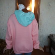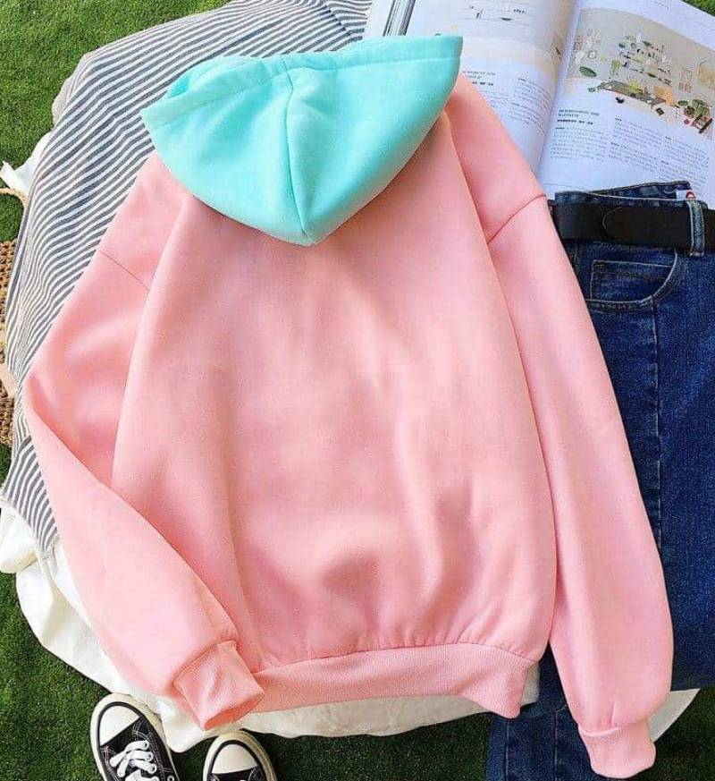This top has two pastel colors on it: pink on the sweatshirt and blue on the hood.