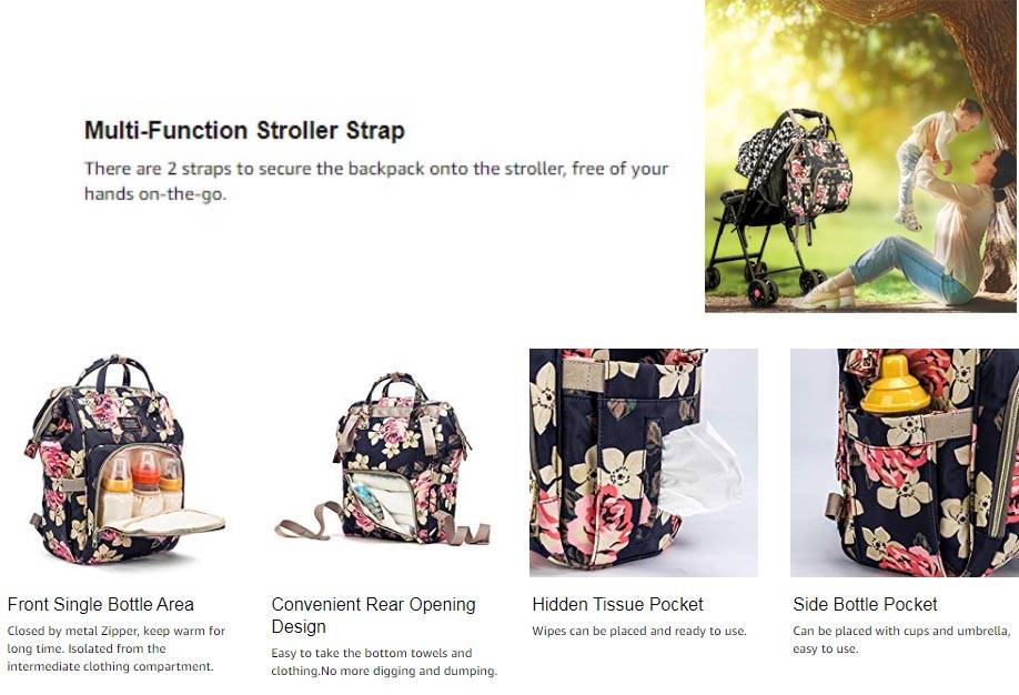 Large capacity – Large main compartment with 12 multi-purpose pockets: milk bottle, baby diaper, towel, water bottle, tissue, etc. You can organize your supplies and your baby’s supplies with ease!